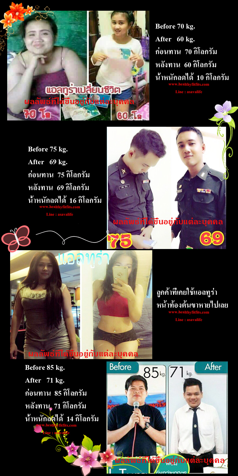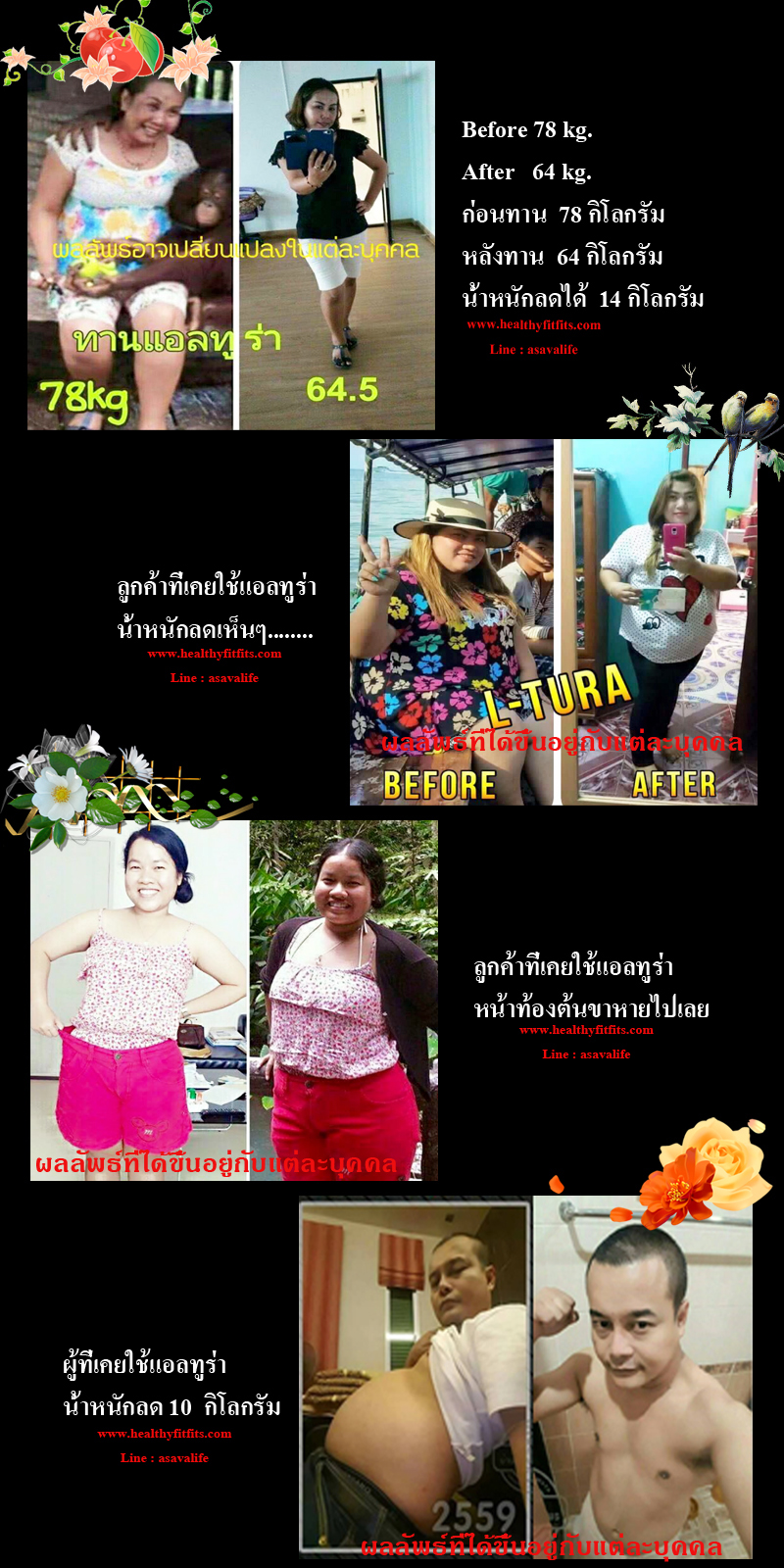 แต่เดิมน้ำหนัก 63กิโลกรัม หลังจากทานแอลทูร่าได้สองเดือนน้ำหนักลดเหลือ 51กิโลกรัม และที่ประทับใจมากคือไขมันส่วนเกินลดลง สัดส่วนกระชับ ใส่เสื้อสวยขึ้น มั้นใจขึ้นจ้า ![]() (ผลลัพธ์ที่ได้ขึ้นอยู่กับแต่ละบุคคล) ปกติไม่อ้วนมาก แต่หน้าน้องไขมันเยอะและลงพุง หากางเกงใส่ยาก เลยลองใช้แอลทูร่า ได้ผลดีมาก หน้าท้องลดลงอย่างเห็นได้ชัดในสัปดาห์ที่สอง และทานต่อเนื่องหมดไป5กล่อง ได้ผลตามนี้เลยจ้า แนะนำเลย ![]() (ผลลัพธ์ที่ได้ขึ้นอยู่กับแต่ละบุคคล) ผมทานแอลทูร่ามาสองเดือนกว่า น้ำหนักลดไป10กิโลกรัมเลยครับ เมื่อก่อนไขมันหน้าท้องเยอะมาก แต่ตอนนี้ลดลงไปเยอะ ผมทานแอลทูร่าแล้วออกกำลังกาย รู้สึกได้เลยว่ามันช่วยเผาผลาญไขมันได้มากกว่าช่วงที่ผมยังไม่ได้ใช้แอลทูร่า แนะนำเลยครับ ได้ผลดีมาก และลดอย่างเป็นธรรมชาติ ไม่มีผลค้างเคียงด้วย