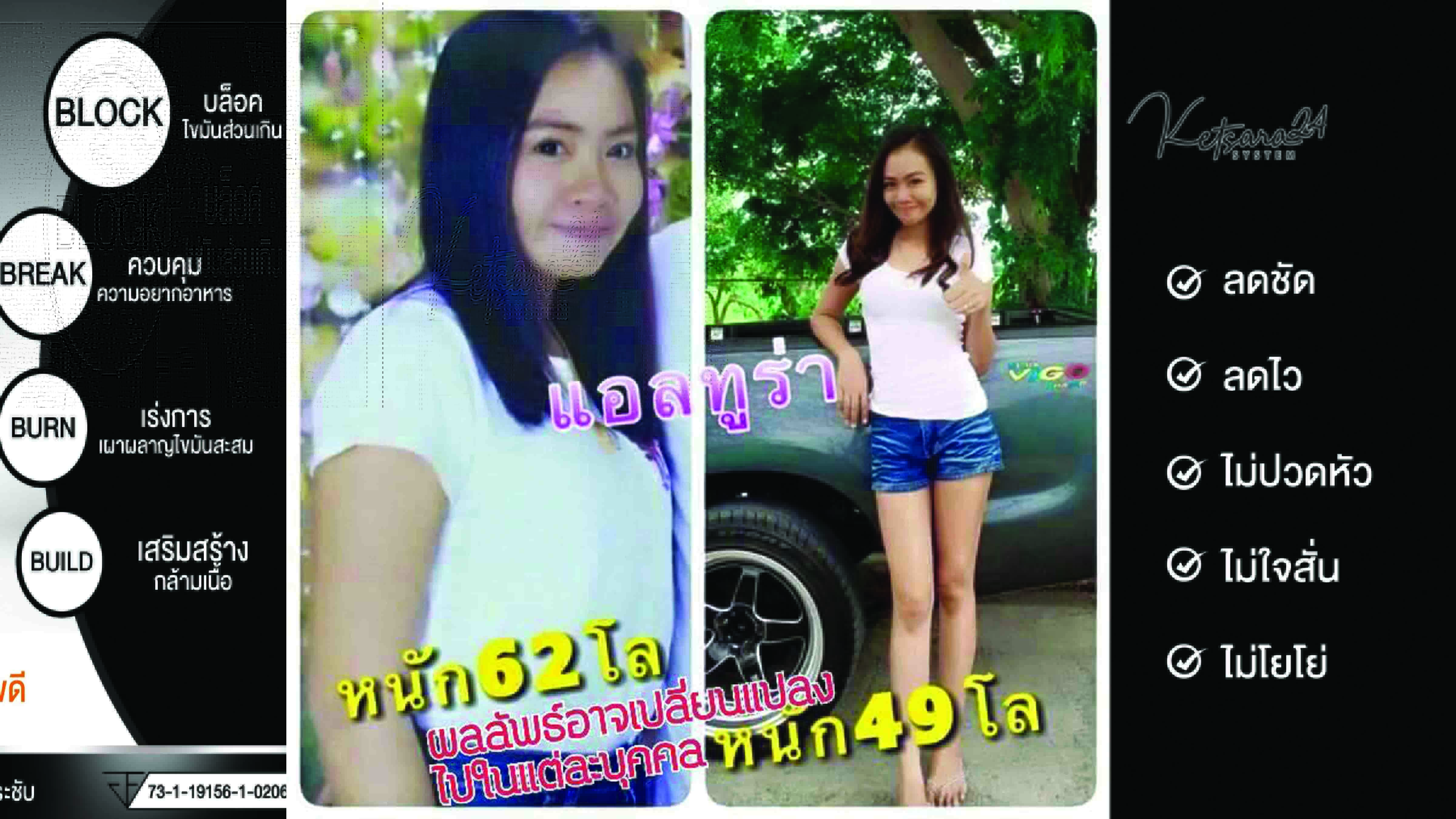 ![]() หนุ่มๆสาวๆหลายท่านที่อยากลดน้ำหนัก คงเคยเจอกับปัญหาผลข้างเคียงต่างๆนาๆ เนื่องจากยาลดน้ำหนักหลายตัวที่วางขายในท้องตลาดมีส่วนผสมของยากดประสาท อาจทำให้ใจสั่น เราขอแนะนำ "แอลทูร่า" สยบปัญหาทุกความอ้วน ไม่มีส่วนผสมของยากดประสาท ทานอาหารได้ตามปกติ ถ้าคุณไม่มีเวลาออกกำลังกาย ลองให้ "แอวทูร่า" เป็นตัวช่วยเปลี่ยนทุกส่วนให้ "เฟิร์ม" เพิ่มความ "กระจ่างใส" ให้กับสุขภาพผิวคุณได้ ![]() แนะนำวิธีรับประทาน ทานวันละ 1 แคปซูล ก่อนอาหารเมื้อเช้า 10-15 นาที สำหรับผู้เริ่มทาน (ไม่ควรปล่อยให้ท้องว่างหลังจากทาน "แอลทูร่า" 15 นาที) ทานวันละ 1-2 แคปซูล ก่อนอาหารเมื้อเช้า 10-15 นาที สำหรับผู้ที่เคยใช้แล้วและอยากให้เห็นผลที่มากขึ้น (ไม่ควรปล่อยให้ท้องว่างหลังจากทาน "แอลทูร่า" 15 นาที)